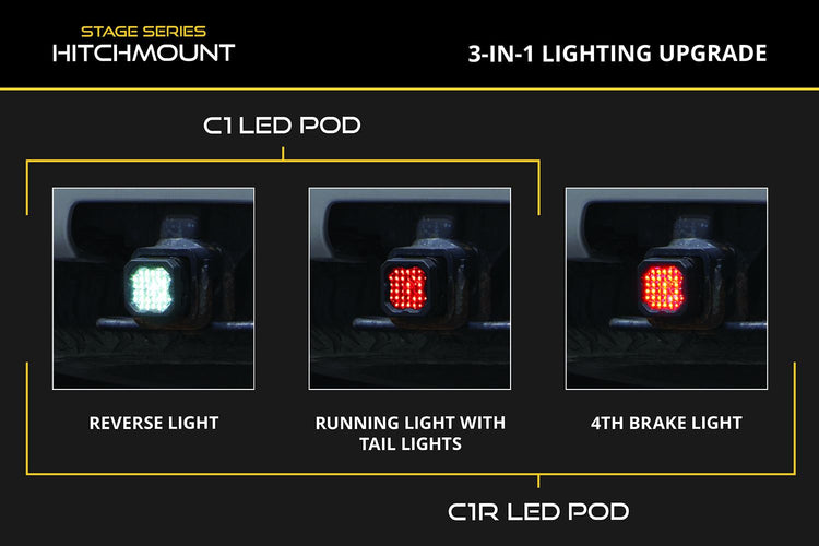 Add significantly more light output when backing up at night with our Stage Series HitchMount Reverse Light Kit! This kit allows you to mount one SSC1 or C1R LED pod in your 2-inch or 2.5-inch trailer hitch receiver, adding a high-power reverse light, additional running light, and an optional 4th brake light with the C1R option. With the included wiring harness, this kit connects to the Toyota 4Runner's factory trailer hitch wiring for simple, everyday operation.