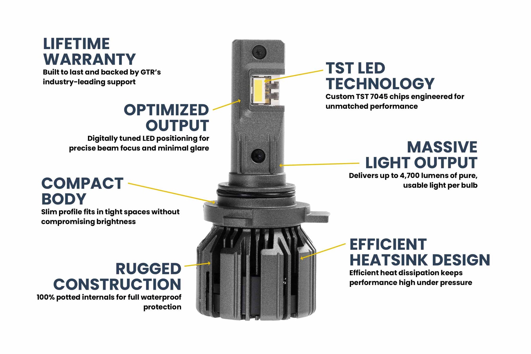 The third generation of the popular GTR LED bulbs are here—providing even more darkness-destroying output than ever before. Unlike its competitors, every aspect has been carefully considered, resulting in a multi-faceted masterpiece that leaves no detail behind. Equipped with custom TST 7045 LEDs, this powerhouse ensures unparalleled performance, while its optimized positioning guarantees efficient light distribution, eliminating wastage. With an unyielding commitment to durability, the GTR Ultra 3 is both 100% potted and waterproof, ready to conquer any challenge. Its compact form belies its strength, providing 4,700 lumens of luminous flux with effortless installation. Backed by a lifetime warranty, it's a bulb that outshines and outlasts the competition.