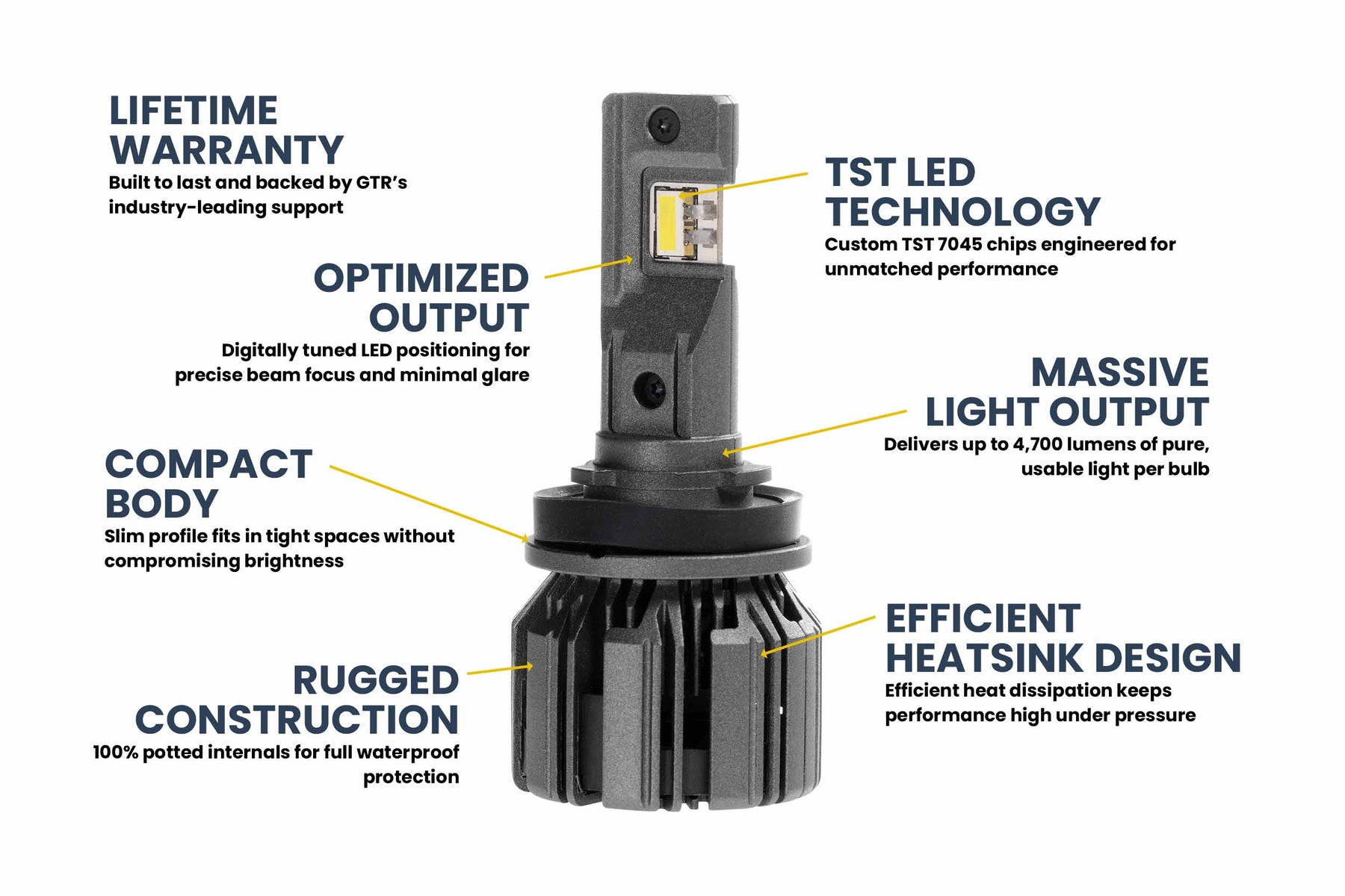The third generation of the popular GTR LED bulbs are here—providing even more darkness-destroying output than ever before. Unlike its competitors, every aspect has been carefully considered, resulting in a multi-faceted masterpiece that leaves no detail behind. Equipped with custom TST 7045 LEDs, this powerhouse ensures unparalleled performance, while its optimized positioning guarantees efficient light distribution, eliminating wastage. With an unyielding commitment to durability, the GTR Ultra 3 is both 100% potted and waterproof, ready to conquer any challenge. Its compact form belies its strength, providing 4,700 lumens of luminous flux with effortless installation. Backed by a lifetime warranty, it's a bulb that outshines and outlasts the competition.
