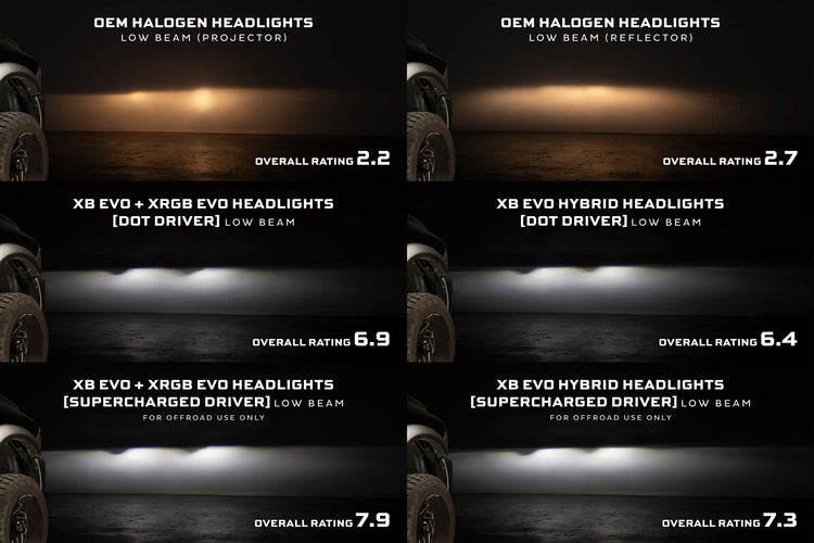 Off Road: Yes, you read that correctly. Out of the box, the XB Evos are only producing a fraction of their potential intensity for compliance reasons. Want more light for your off-road adventures? The optional Supercharged LED driver boosts both low and high beam intensity by approximately 30-50% -- all without sacrificing reliability or warranty. While the Supercharged drivers easily enable the XB Evo to outshine every other headlight for the Ram on the market, we must reiterate that they will result in non-compliant levels of peak beam intensity and therefore should not be used on public roads.