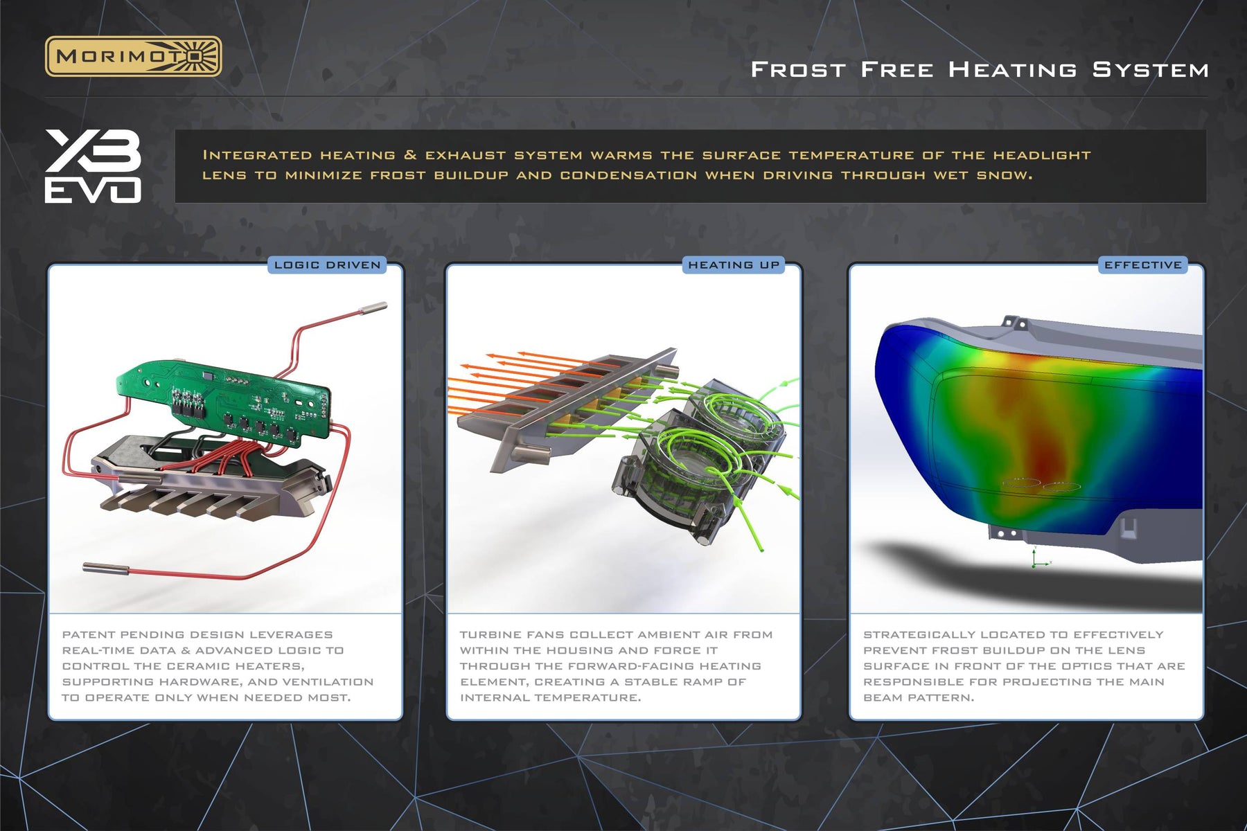 Frost-Free System: Our patent-pending heating system warms the surface temperature of the headlight lens to minimize frost buildup when driving through wet and snowy conditions in the wintertime. When the temperature drops below 5 degrees Celsius, the system is enabled to operate on your command by flashing the high beams four times. The lights will confirm that the heating function is operating by flashing the high beams twice. From there, it will automatically maintain temps within the headlight housing to mitigate frost buildup on the lens. A cold-climate game changer, this feature ensures the output of your XB Evo headlights will remain strong when you need it most.