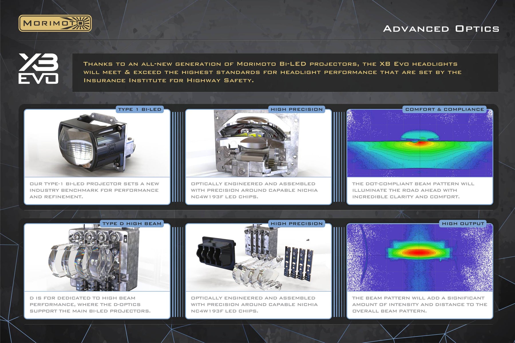 Evolutionary: A simple design refresh would have been easy, but that's not what this is all about. The all-new XB Evo headlights are a showcase of everything Morimoto is made of. From concept to completion. Packed with features that demonstrate a true attention to detail including the latest in technology, compliance, quality, and styling, these headlights are designed for enthusiasts who are serious about all the above, even if it comes at a premium.