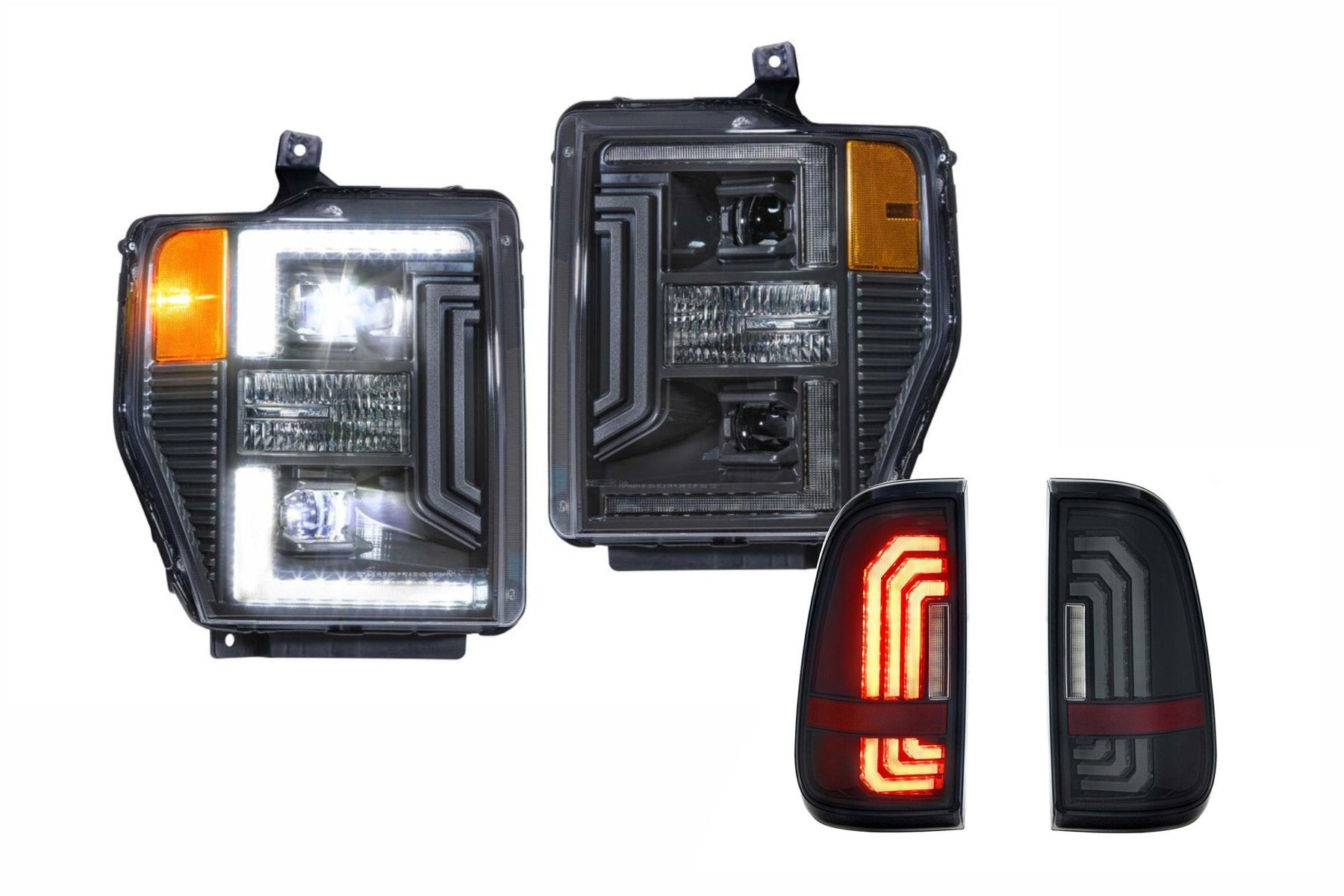 Headlights: Facelift by Morimoto: Just because you're driving an older truck doesn't mean you don't deserve to see and be seen. The Hybrid LED Headlights from Morimoto for the 08-10 Ford Super Duty are a front-end game changer for your truck. New look, more light, and reasonably priced... what is not to like? Updated Design: The design of the Morimoto XB Hybrids for the 08-10 Super Duty trucks is reminiscent of the more modern OEM LED headlights and there's no question-- It is quite fitting as a facelift on these trucks. The LED daytime running light is powered by Osram 5000K LEDs and is probably bright enough to illuminate the road more effectively than your stock halogen Ford Super Duty headlights. Hybrid Turn Signals: With the XB Hybrids, you'll re-use your stock halogen turn signal bulb right there in the center of the light-- which on one hand is nice in order to avoid any hyperflash shenanigans. Of course, if you're all about having an LED turn signal, no problem... you could put a set of plug n play LED bulbs in the middle too, which we also offer. Performance and Precision: Morimoto continues to build headlights that aren't all about looks and nothing more. We've seen the full spectrum, trust us, most aftermarket headlights end up being a downgrade in the light output department-- but that's far from the case here. The XB hybrids use a dedicated low and high beam LED projector that produces a supremely wide, bright, and properly distributed beam pattern. Throw. Your. Old. Headlights. Away. Now. Not only that, but these optics meet & exceed all SAE, DOT standards, and come out of the box fully aimed to OEM spec (yes, they are adjustable too). Plug and Play Wiring: As for wiring, Morimoto's LED headlights are designed to work on your SuperDuty without any modifications. Very simple plug n play setup with just a few connections that you should be able to setup in no time. Nobody likes to cut and splice wiring, and Morimoto respects that. Special: What does an older Super Duty and a new U-haul truck have in common? Well, the stock, garbage headlights of course! If you have this truck, you're probably struggling to see much of anything at night... that's no mystery, that's reality. Give yourself and your truck the well-deserved gift of vision, safety and style. Get yourself a set of the Morimoto XB Hybrid LED headlights for the 08-18 Ford Super Duty. Tail Lights: Ford Super Duty Tail Lights: While every biz in the aftermarket has a catalog full of products for these trucks, somehow no brand has yet to deliver a worthy set of tail lights for this body style... until now. The Morimoto XB LED tail lights are the category killer that every 99-16 F250, F350, or F450 owner has been waiting for!Reverse Lights: Often over-looked, but not with the Morimoto XB tail lights for the Super Duties. While they come standard with powerful LED reverse lights, just wait, there's more! Morimoto's Backup-Boost system allows you to plug n play with the optional LED Reverse Light Bar, which mounts to the top of your license plate frame and provides an extra 5000 lumens of controlled light output when in backing up. Yeah, Morimoto customers like to see where they're going... no matter the direction!Style: Dropping in some rear-facing LED chips would have been much easier and far less expensive to produce due to the tight spacing inside these housings... and while thats what every other brand to date has done, thats not how we roll. Instead, these have a much more modern look. Three sets of 3D light blades are illuminated from the rear with integrated TIR optics, and serve as the brake light and turn signal. Pair that with the surrounding muscular trim, optional smoked or red outer lens, and we've easily got what is the best-looking set tail lights on the road for the 99-16 Super Duties!Style and Safety: All Morimoto tail lights are designed to comply with all DOT, SAE regulations for rear-facing lamps. We pride ourselves on offering stylish, high-performance and safe products for serious enthusiasts, which is why all new Morimoto products are verified by trusted third party labs for compliance and are backed with an industry-leading five year warranty.
