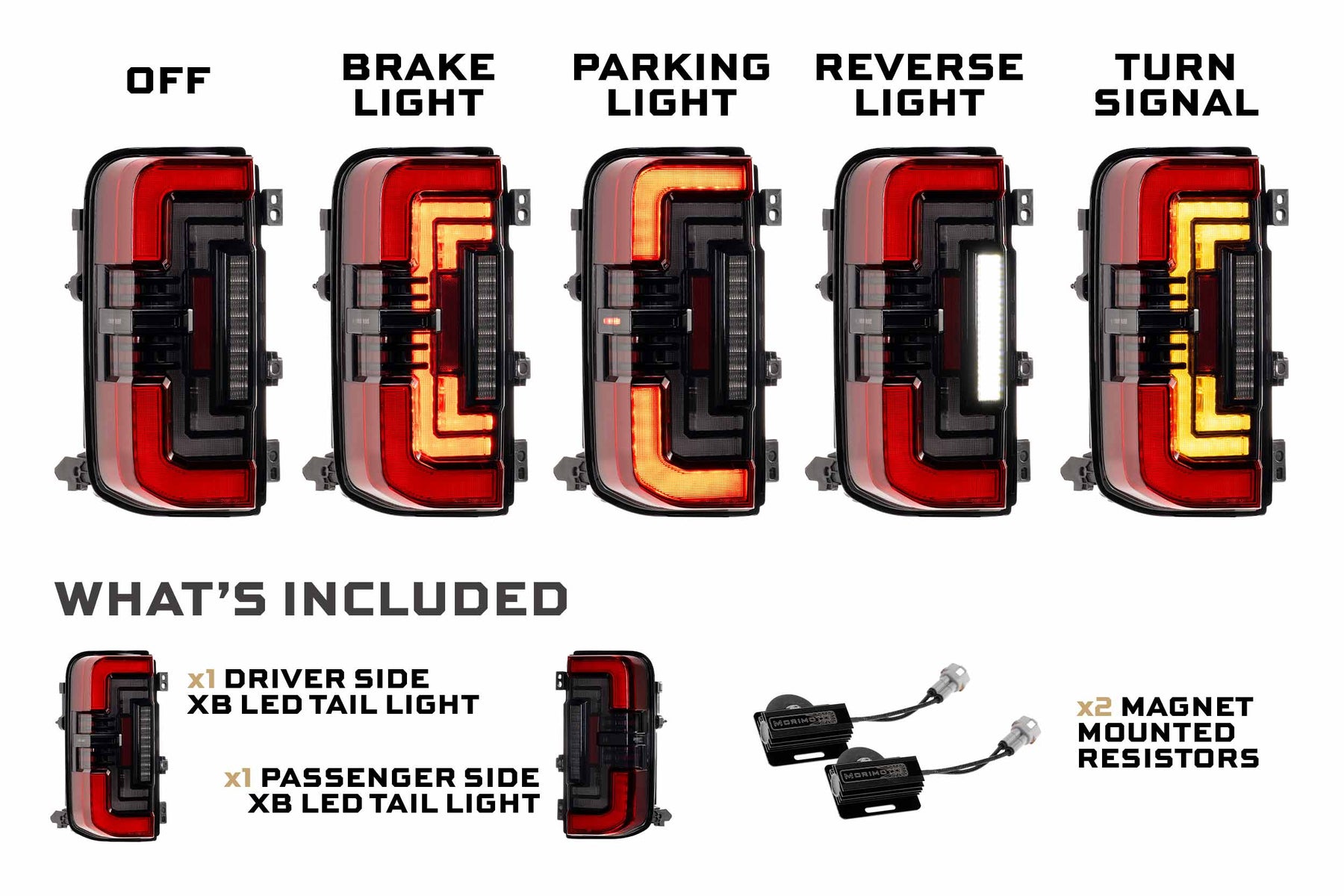 Reverse Lights: Are often over-looked, but not with the Morimoto XB tail lights for the Bronco. While they come standard with powerful LED reverse lights, just wait, there's more! Morimoto's BLBB system allows you to plug n play with the optional LED Backup Boost Bar which mounts to the top of your license plate and provides an extra 2,700 lumens of controlled light output in reverse. Yeah, Morimoto customers like to see where they're going in reverse too!
