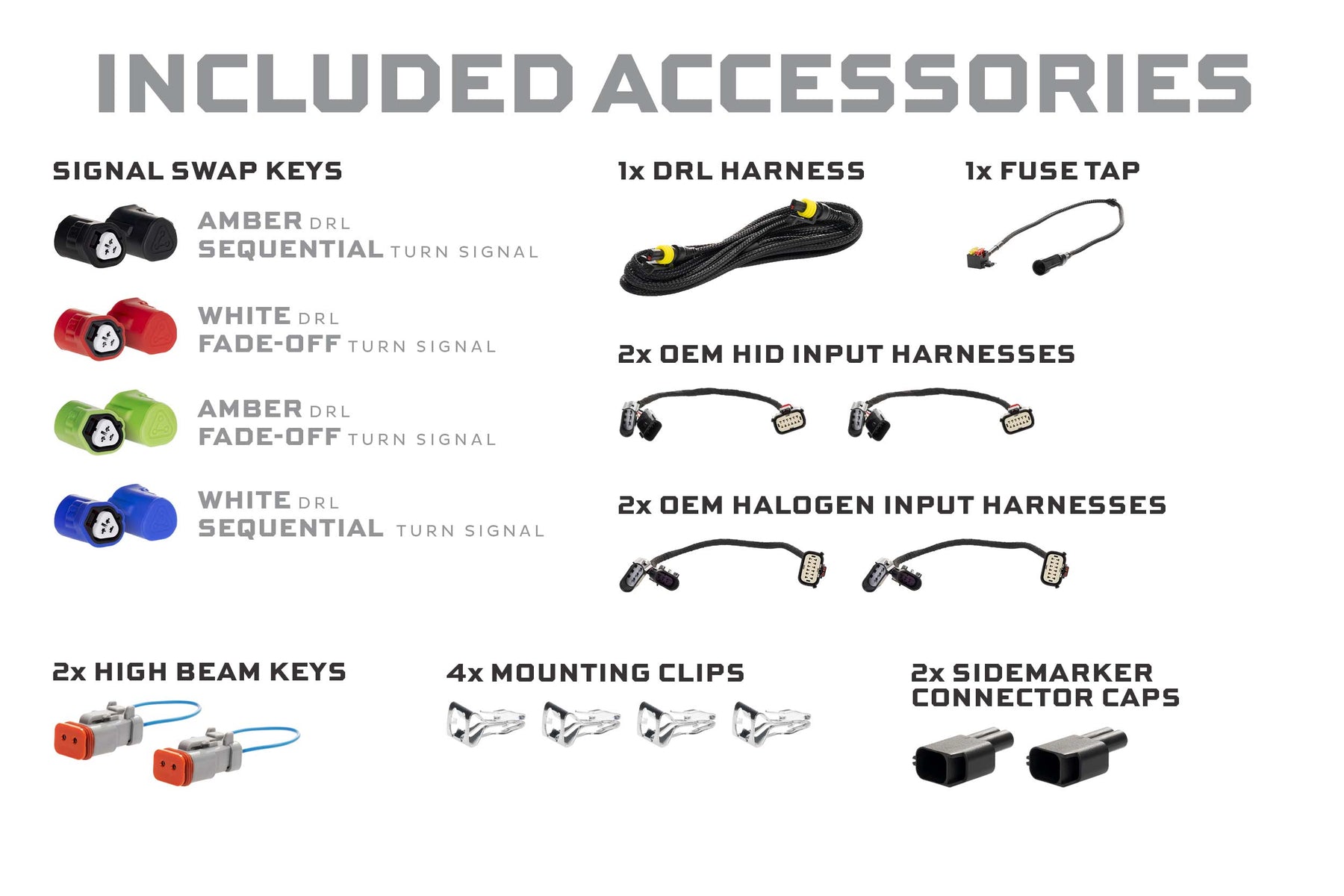 Accessories: 2x Halogen Input Harnesses, 2x OEM HID Input Harnesses, 1x DRL Harness, 2x High Beam Keys, 4x Mounting Clips, 2x Side Marker Connector Caps, Fuse Tap Hardware