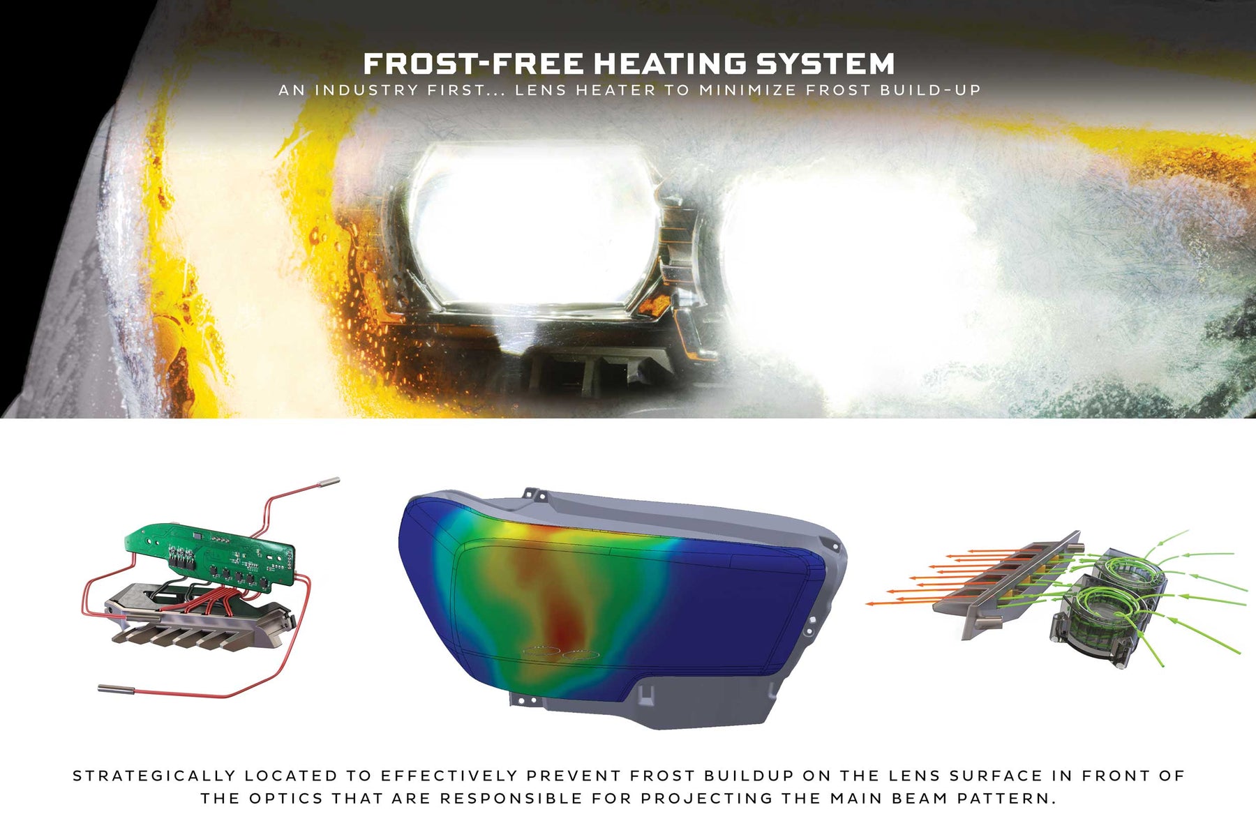 Frost-Free System: Our patent-pending heating system warms the surface temperature of the headlight lens to minimize frost buildup when driving through wet and snowy conditions in the wintertime. When the temperature drops below 5C/41F, the system is enabled to operate on your command by flashing the high beams four times. The lights will confirm that the heating function is operating by flashing the high beams twice. From there, it will automatically maintain temps within the headlight housing to mitigate frost buildup on the lens. A cold-climate game changer, this feature ensures the output of your XB Evo headlights will remain strong when you need it most.