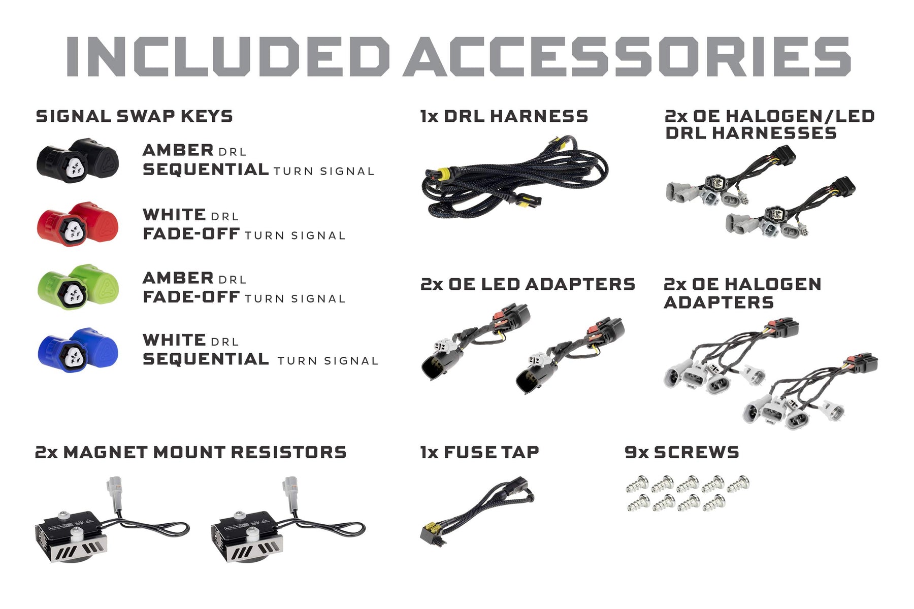 Wiring: 2x Halogen Adapters, 2x LED Adapters, 2x Magnet Mount Resistors, 1x DRL Harness, 1x Fuse Tap, 9x Screws