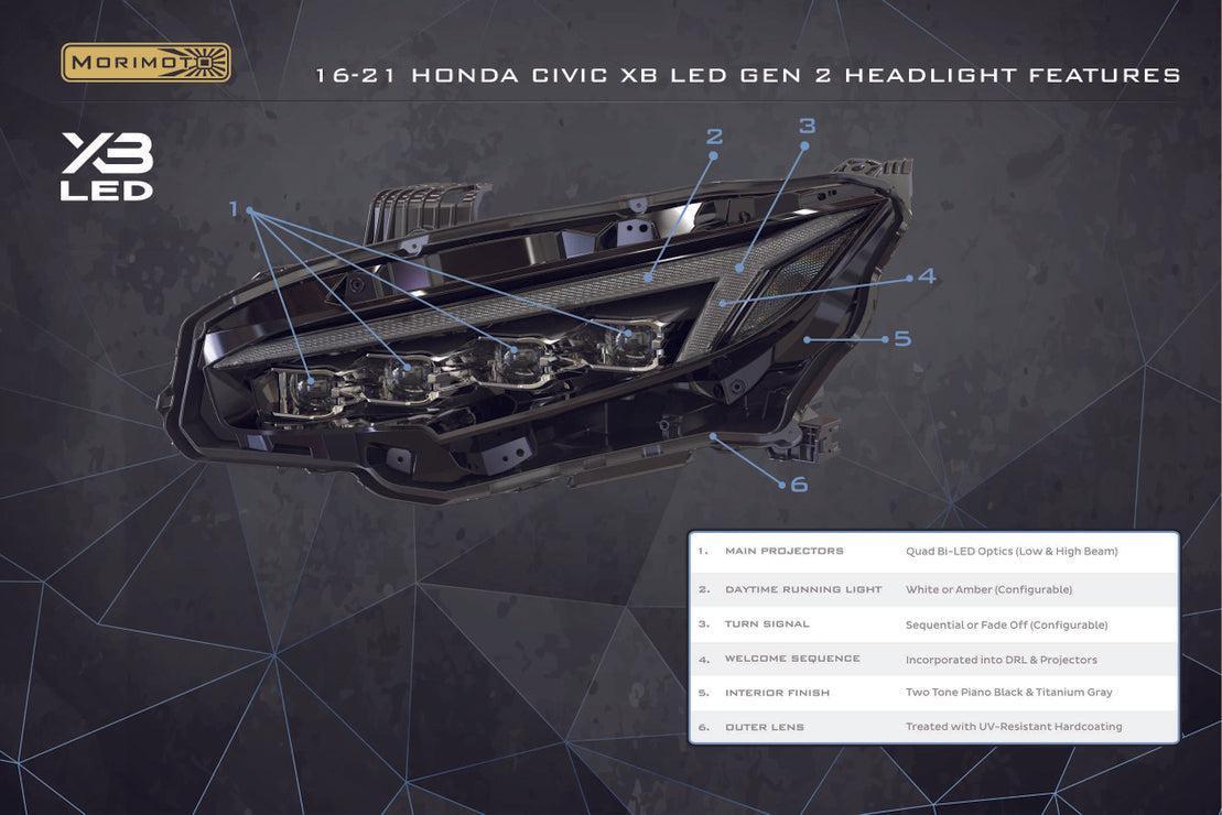 MAXIMUM PERFORMANCE: Thanks to an array of generation of high output Bi-LED projectors, the Gen II Civic XB headlights will meet & exceed the highest expectations in the performance department. Here, our new Honda Civic headlight utilizes Quad Bi-LED projectors to deliver unmatched light output, with an incredibly bright and wide low beam, and a high beam that destroys darkness. The Morimoto XB LED Headlights are DOT compliant with all FVMSS108 regulations for on-road use in the USA.