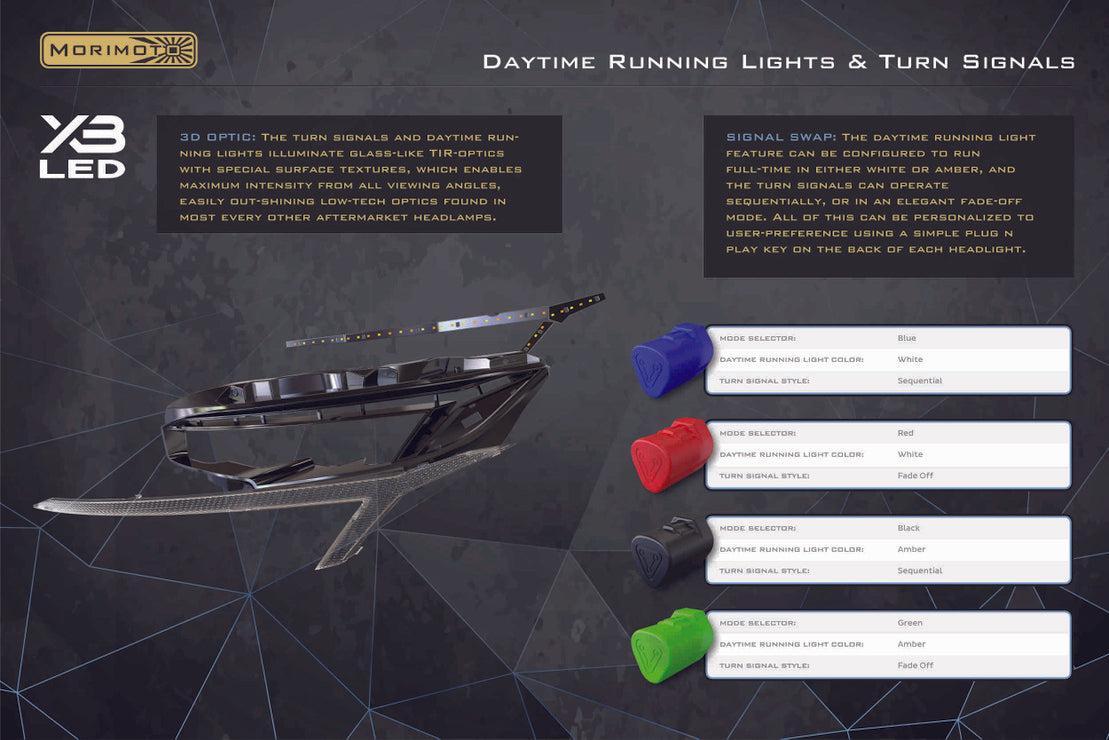 EASY TO PERSONALIZE: The signal swap system allows users to personalize how the daytime running lights and turn signals operate according to personal preference, all through a simple plug-n-play key on the back of each headlight. The DRL can be configured to run full-time in either white or amber with no compromise in intensity either way. The turn signals can operate sequentially from side to side, or in a more traditional on-off mode with an elegant fade-off effect.