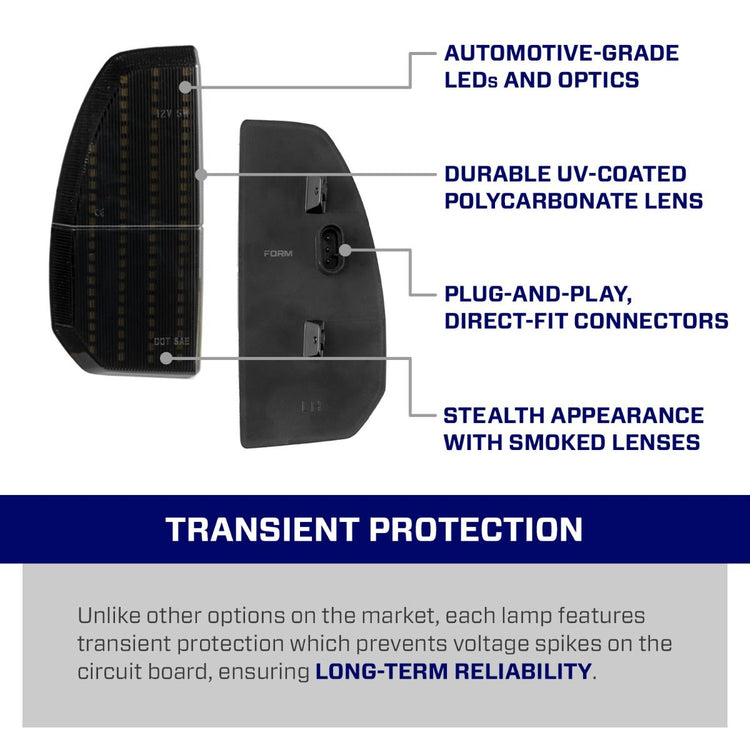 OEM-Grade Construction. Form Lighting mirror lights are built with quality in mind and constructed using OEM-grade materials, including a UV-coated polycarbonate lens, automotive-grade LEDs and optics, and direct-fit connectors. Unlike other options on the market, each lamp features transient protection, which prevents voltage spikes on the circuit board, ensuring long-term reliability. While they may not be the cheapest option on the market, the fit and finish of Form Lighting's lamps are superior to other aftermarket units.