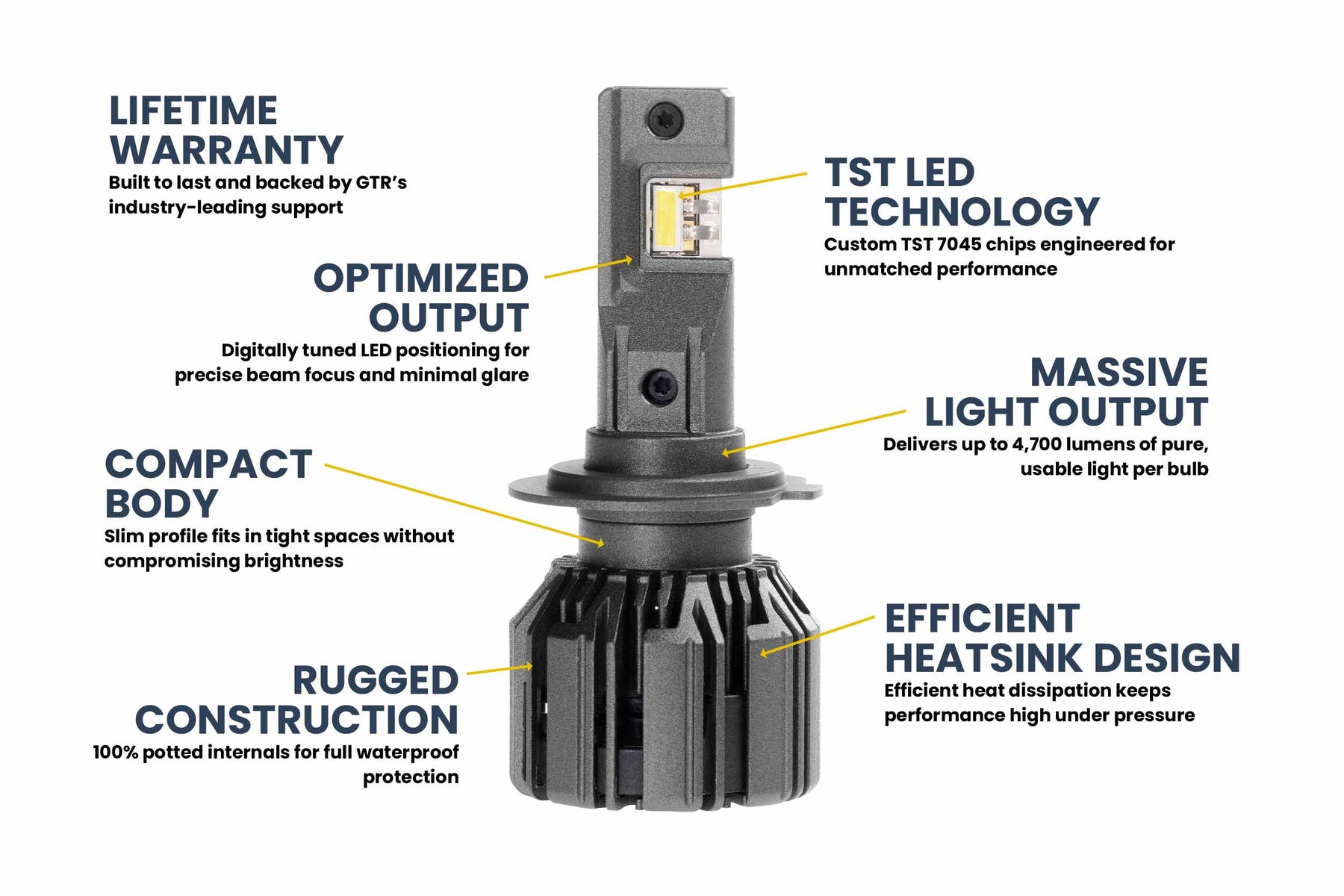 The Best: While so many others use Philips or CREE LED chips, GTR went with a custom TST 7045 chipset option to ensure better results. Those results show through to the finished product too thanks to digitally optimized LED positioning that most closely matches the original filament tolerances. Combining these features is the key to getting all the light from the source to the reflector surface and ultimately onto your target without wasted lumens and glare all over.