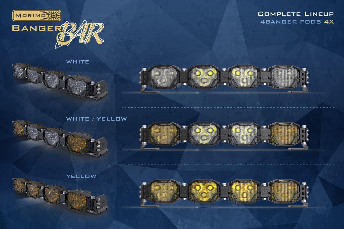 Off-Road Reinvented: Since 2008, Morimoto has been building the best lighting upgrades for the automotive aftermarket... consistently turning out products packed with more performance, reliability, and best in-class fitment & style. The Double row BangerBar continues that tradition as a bespoke light bar, where you spec the power. You spec the color. You spec the length. You set the radius. And then you destroy the darkness. Every bar is pre-spec'd with the 4Banger Pods, the inner links, a set of universal end-mounts, and all the hardware necessary to assemble.