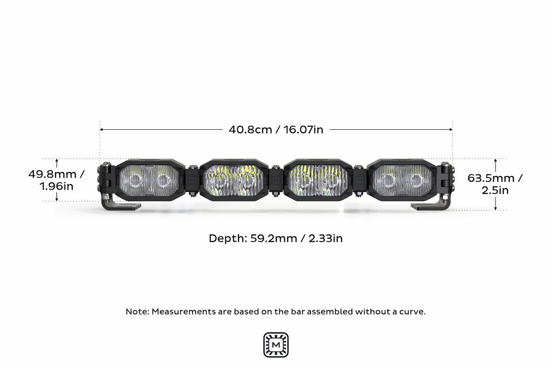Off-Road Reinvented: Since 2008, Morimoto has been building the best lighting upgrades for the automotive aftermarket... consistently turning out products packed with more performance, reliability, and best in-class fitment & style. The Single row BangerBar continues that tradition as a bespoke light bar, where you spec the power. You spec the color. You spec the length. You set the radius. And then you destroy the darkness. Every bar is pre-spec'd with the 2Banger Pods, the inner links, a set of universal end-mounts, and all the hardware necessary to assemble.