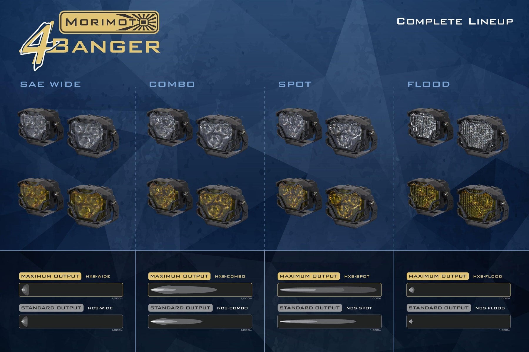 Off-Road Reinvented:Â Since 2008, Morimoto has been building the best lighting upgrades for the automotive aftermarket... Consistently turning out products packed with more performance, reliability, and best in-class fitment & style. As a new player in the off-road game, we have embraced that philosophy big time, pumped up the Redbull intake, and now it's time for the old competition to rethink their strategy. The brand new, patent-pending line of 4Banger Off-Road LED lights were completely designed, engineered, and tested in the USA, and everything about them is truly next level.