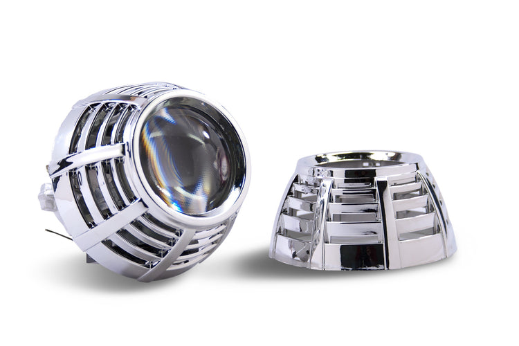 G37-R: Vents Galore make the G37-R shroud stand out. This radically designed shroud offers all the coverage you need, but still allows light to escape through the four staggered layers of chrome bands that surround it's body. The G37-R shrouds are inspired by the OEM Infiniti G headlight shroud, taking that design and making it more ideal for retrofitting.