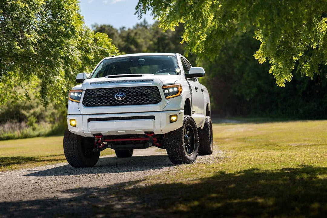 SEQUENTIAL LED DRL: Now here comes the game changer here guys. These bad boys are available with your choice of either a white daytime running light, or an all-amber version, which I absolutely love. Either one is powered by Osram LEDs and it is insanely bright, easily visible during the day. The amber looks at-home on Tundras that are decked out with matching off road lights from other well-known brands like Baja or KC HiLites, and the white version looks crispy and modern. They also have a separate optic that's dedicated to the turn signal function--which can be ran in a full on/off mode, or the sequential setup that everybody loves.
